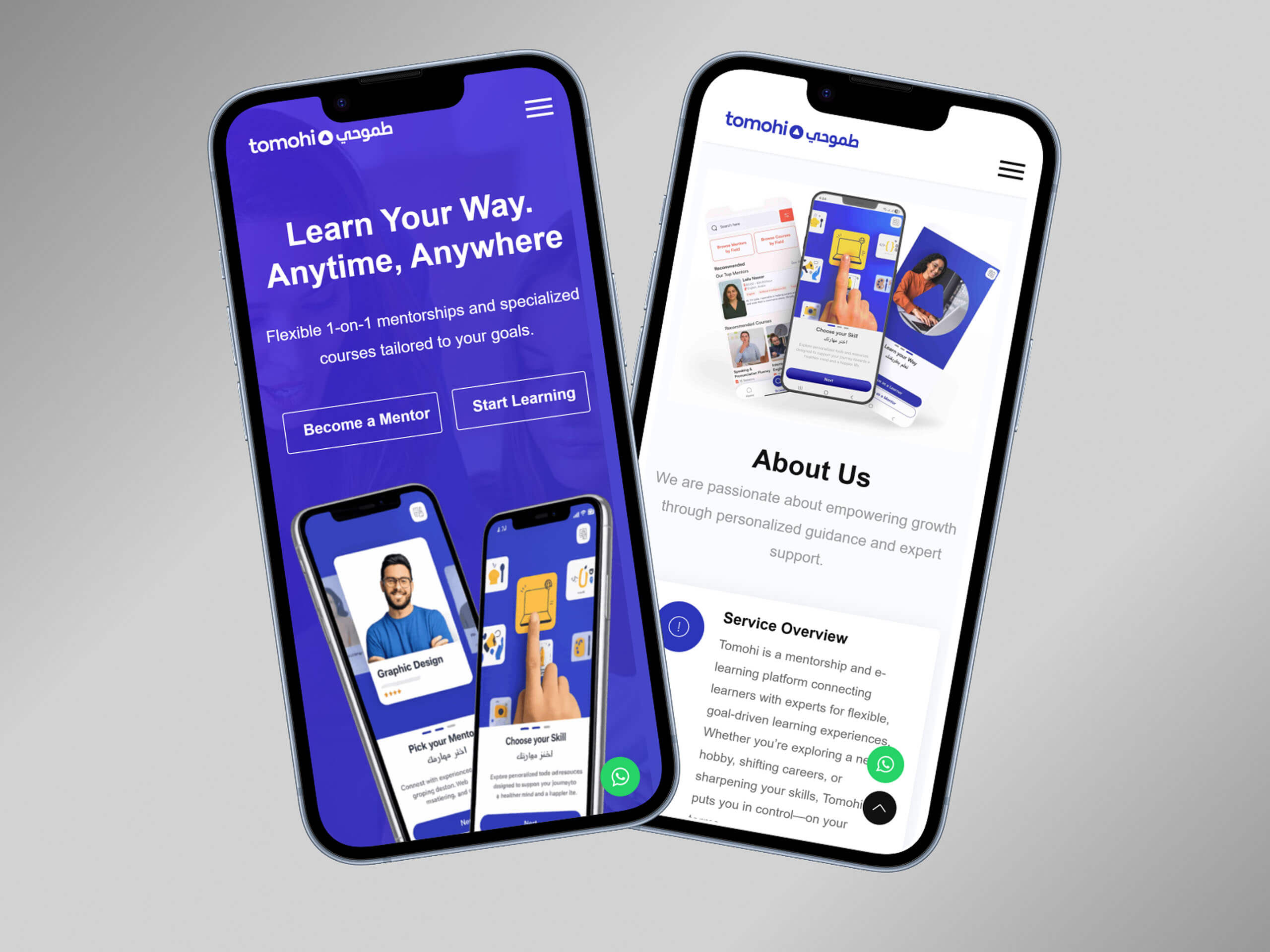 Tomohi is a dynamic mentorship and e-learning platform that connects learners with expert mentors across diverse fields, from business and technology to culinary arts and personal development. The website and mobile app focus on flexibility, user experience, and accessibility, allowing users to book 1-on-1 sessions, explore specialized fields, and learn at their own pace. With clear structure, bilingual support, and seamless navigation, Tomohi redefines digital learning in the Middle East through innovation, personalization, and user-first design.